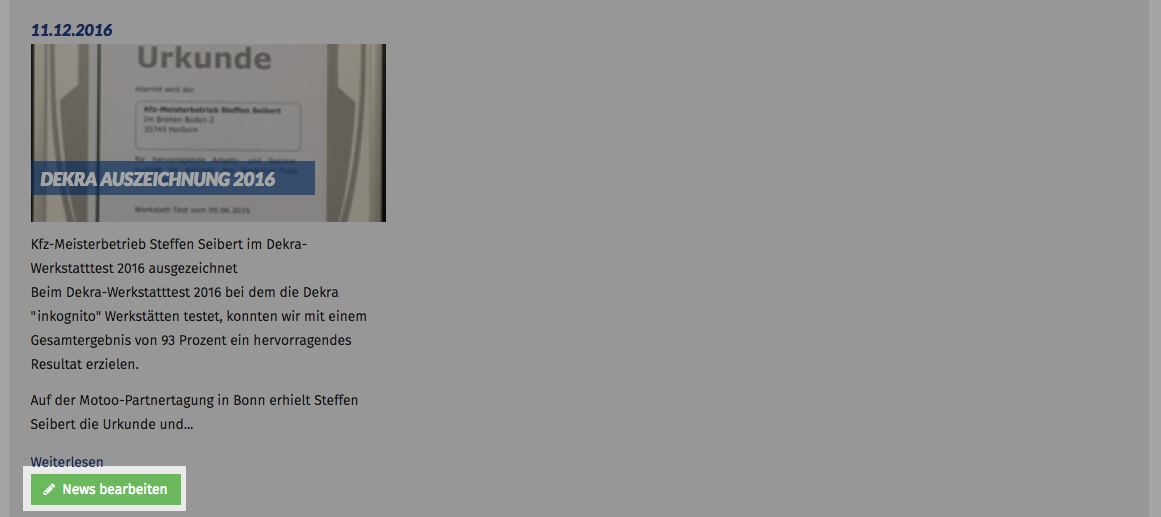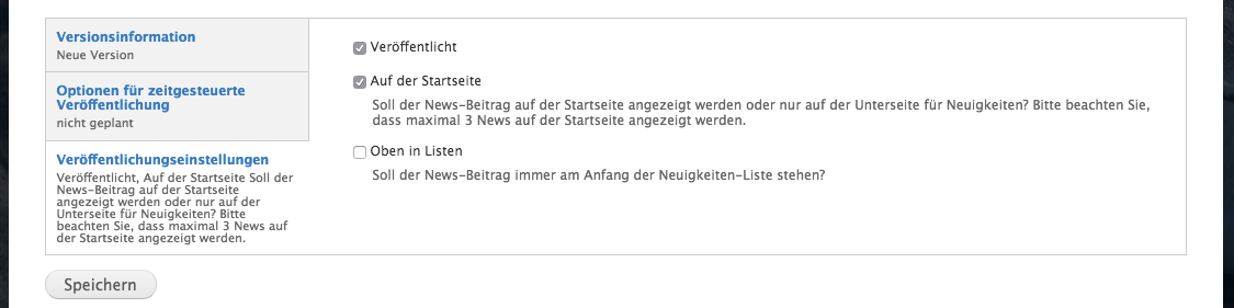 Für News / Neuigkeiten gibt es besondere Einstellungen, um zu steuern, welche davon auf der Startseite angezeigt werden und welche nur auf der Unterseite für Neuigkeiten. Auf der Startseite ist jeweils nur Platz für drei News-Beiträge.